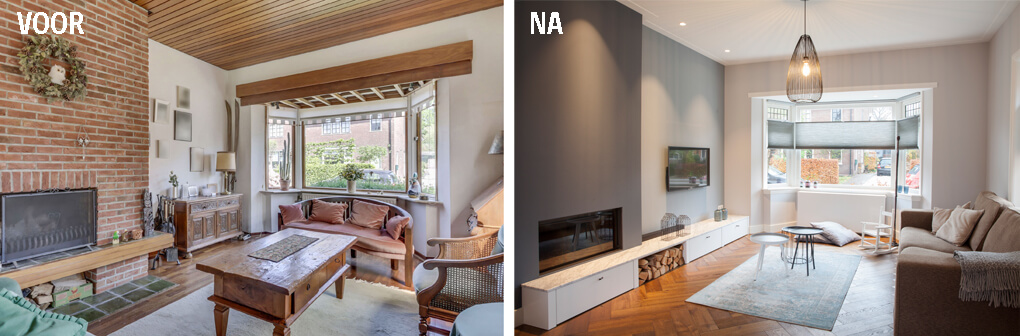 En omdat de openhaard relatief veel ruimte van de woonkamer in beslag nam, is ook deze op inventieve wijze aangepakt en verwerkt in de wand naar de gang. Al met al nam het vloeroppervlak op de begane grond toe van 54 m² tot 79 m². Met behoud van de jaren ‘30 details, die bovendien beter uitkomen, nu de wanden in blauwtinten zijn geschilderd. Een metamorfose die tot stand kwam door een plezierige samenwerking tussen bewoners, ontwerpster en uitvoerende partijen.
